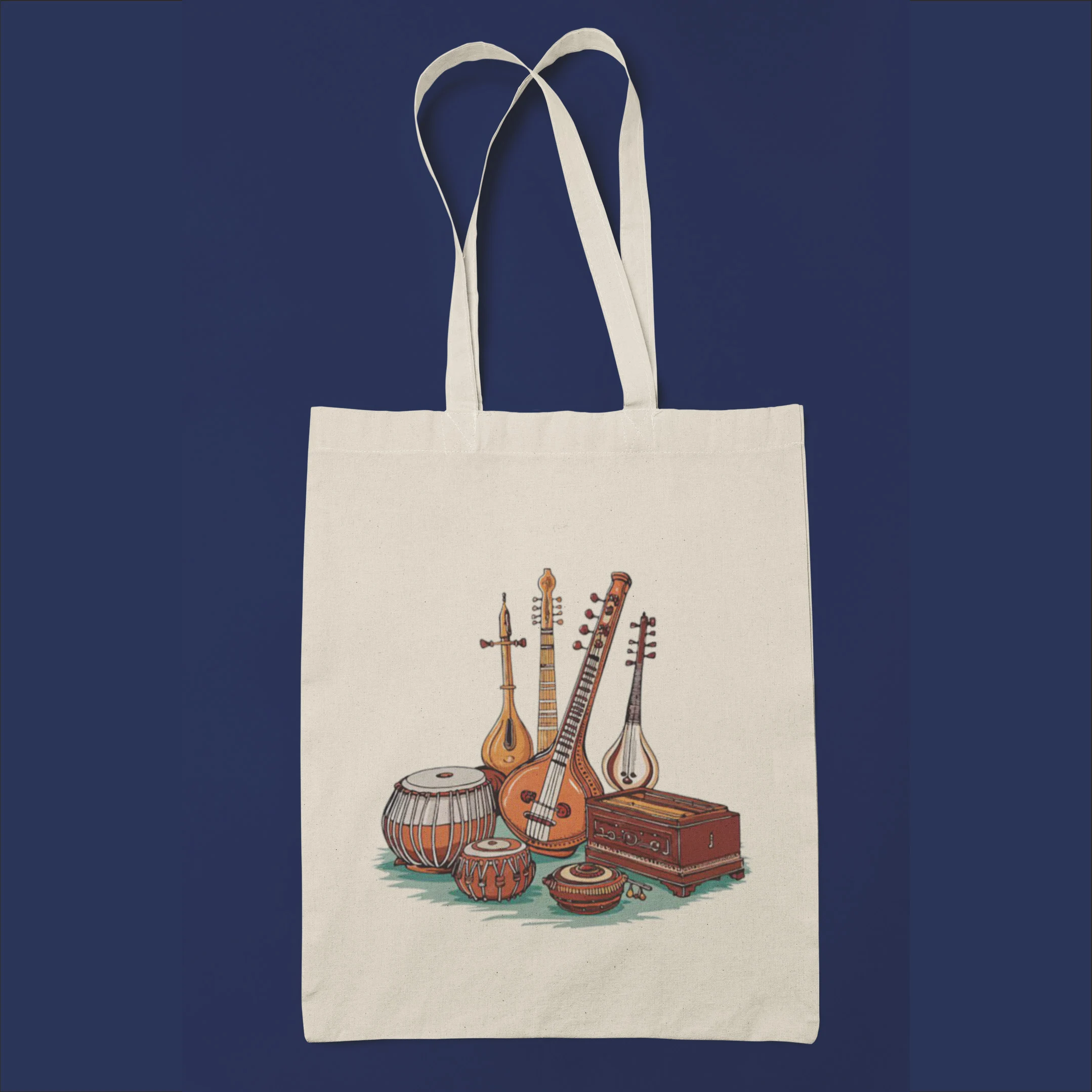 Discover the perfect blend of style and functionality with our musical instruments print tote bag. Crafted from durable, eco-friendly beige canvas, this spacious tote showcases a vibrant, eye-catching illustration of traditional musical instruments, ideal for music enthusiasts and anyone seeking a unique accessory.
